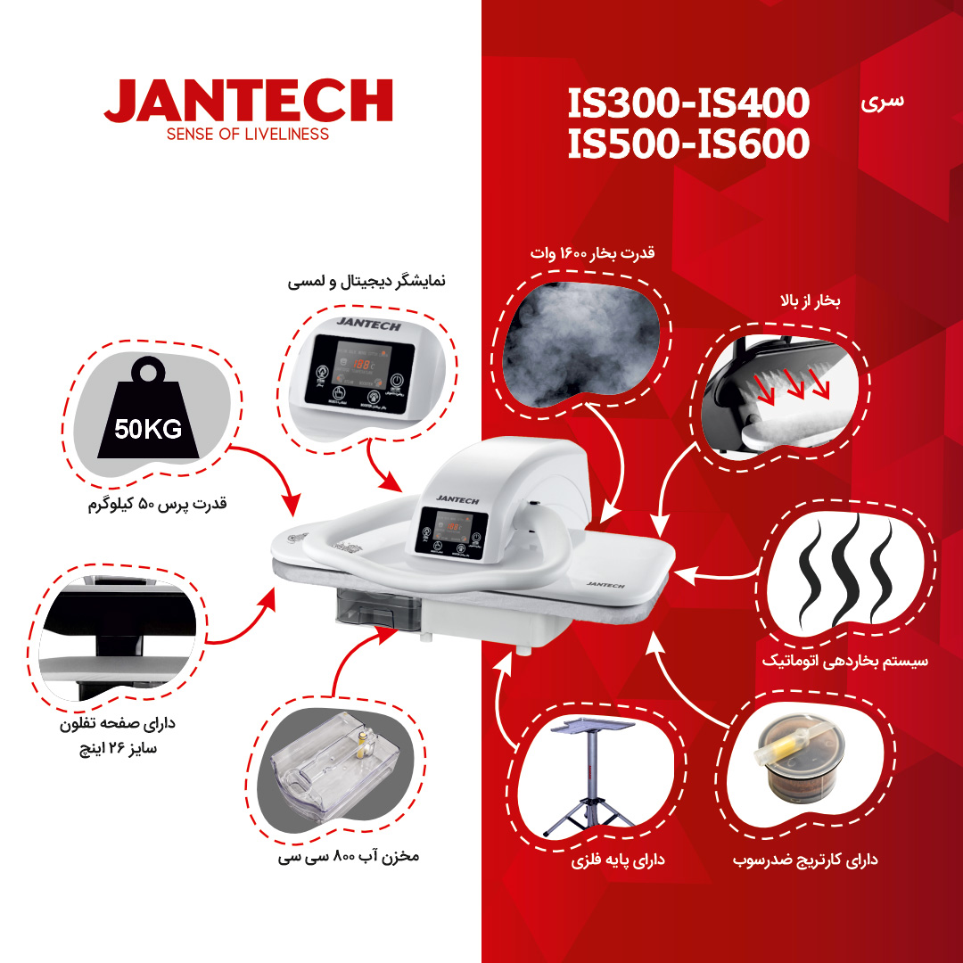 اتو پرس جانتک IS300-IS400-IS500-IS600 دارای مشخصات فنی یکسانی میباشند و تفاوت آنها در رنگ دستگاه میباشد._x000D_
