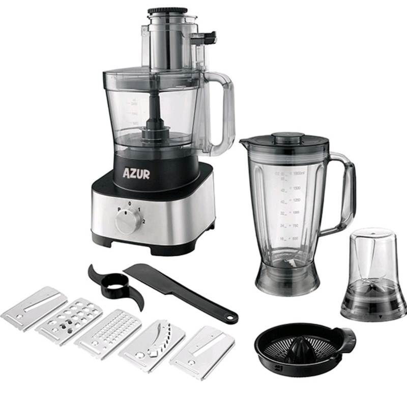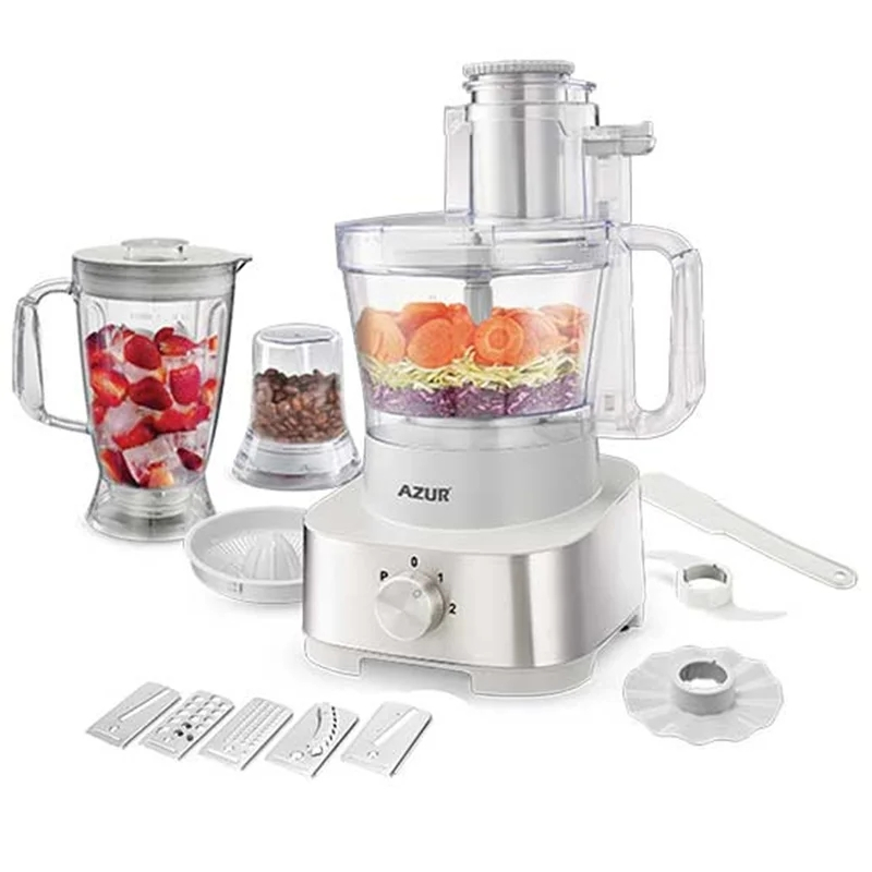غذاساز آزور مدل AZ-271FP با توان 1000 وات با تنظیم قدرت دو حالته و قابلیت های غذاساز ، خرد کن ، آسیاب ،آب مرکبات گیری و خمیر زن … این مدل غذاساز از 5 رنده مختلف برخوردار است