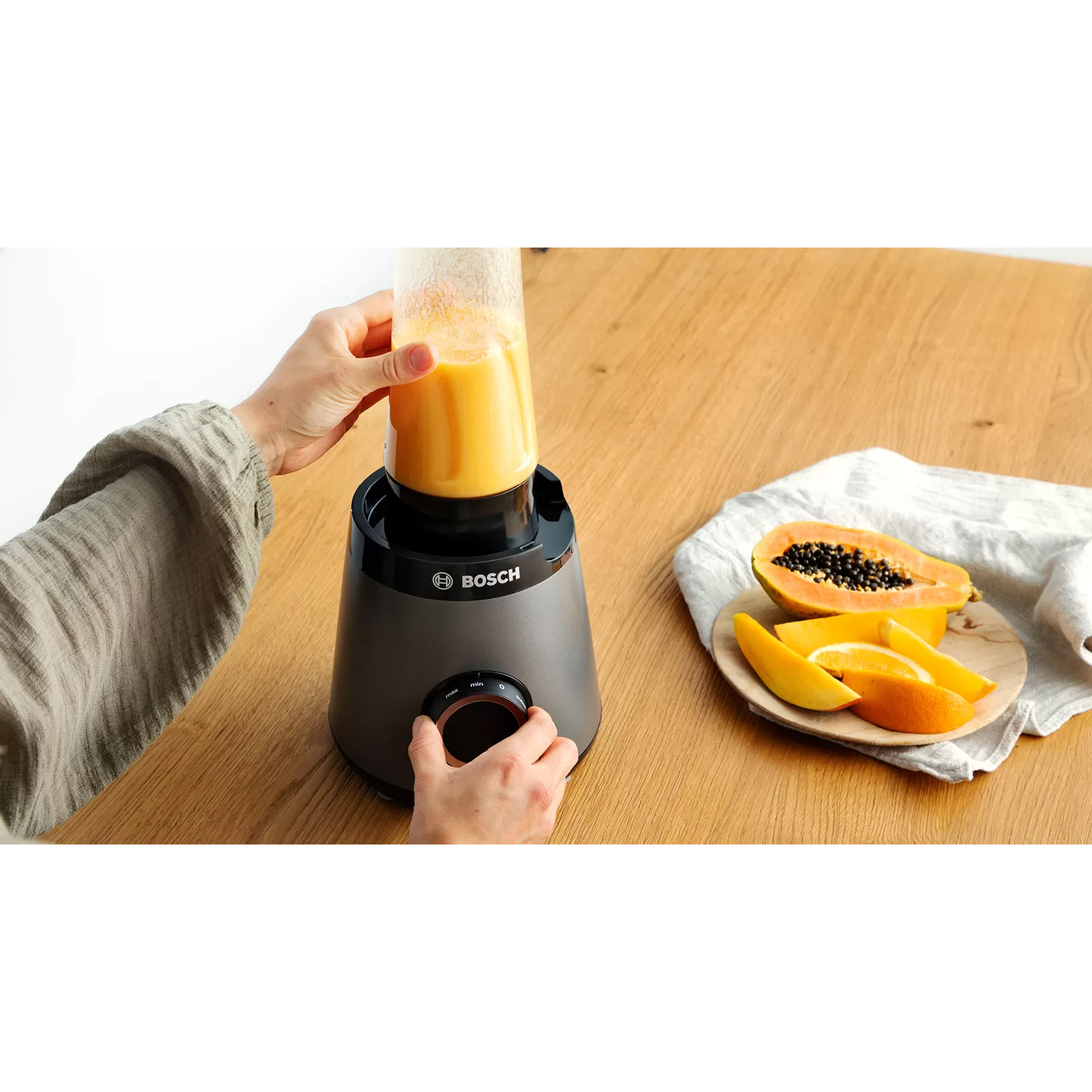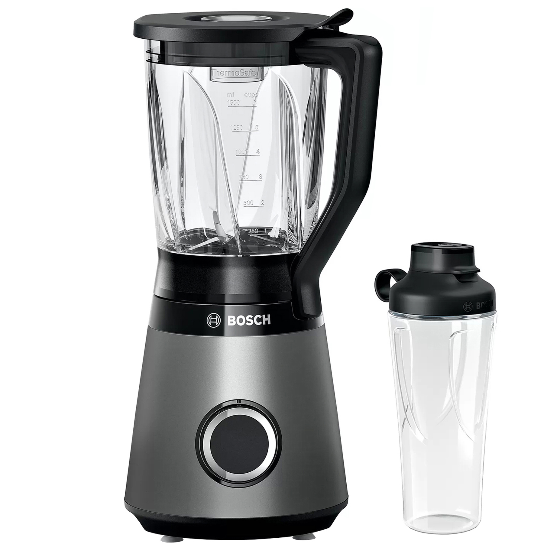 مخلوط کن و اسموتی ساز فوق پیشرفته و حرفه ای مدل MMB6174S یکی از محصولات جدید و با کیفیت کمپانی آلمانی بوش می باشد.این محصول با بهره مندی از موتور پرقدرت 1200وات با دور موتور 30000 دور در دقیقه می تواند تمام نیازهای شما را برطرف کند.اگر شما از آن دسته کسانی هستید که می خواهید در محیط کار یا هنگام رفتن به بیرون و باشگاه نوشیدنی های طبیعی میل کنید ، خرید این دستگاه برای شما ضروری می باشد . چون همراه این محصول یک بطری 0.6 لیتر عرضه شده است که شما بعد از درست کردن اسموتی می توانید نوشیدنی های خود را داخل این بطری قرار دهید و با خود حمل کنید همچنین درب این بطری کاملاً وکیوم می باشد.