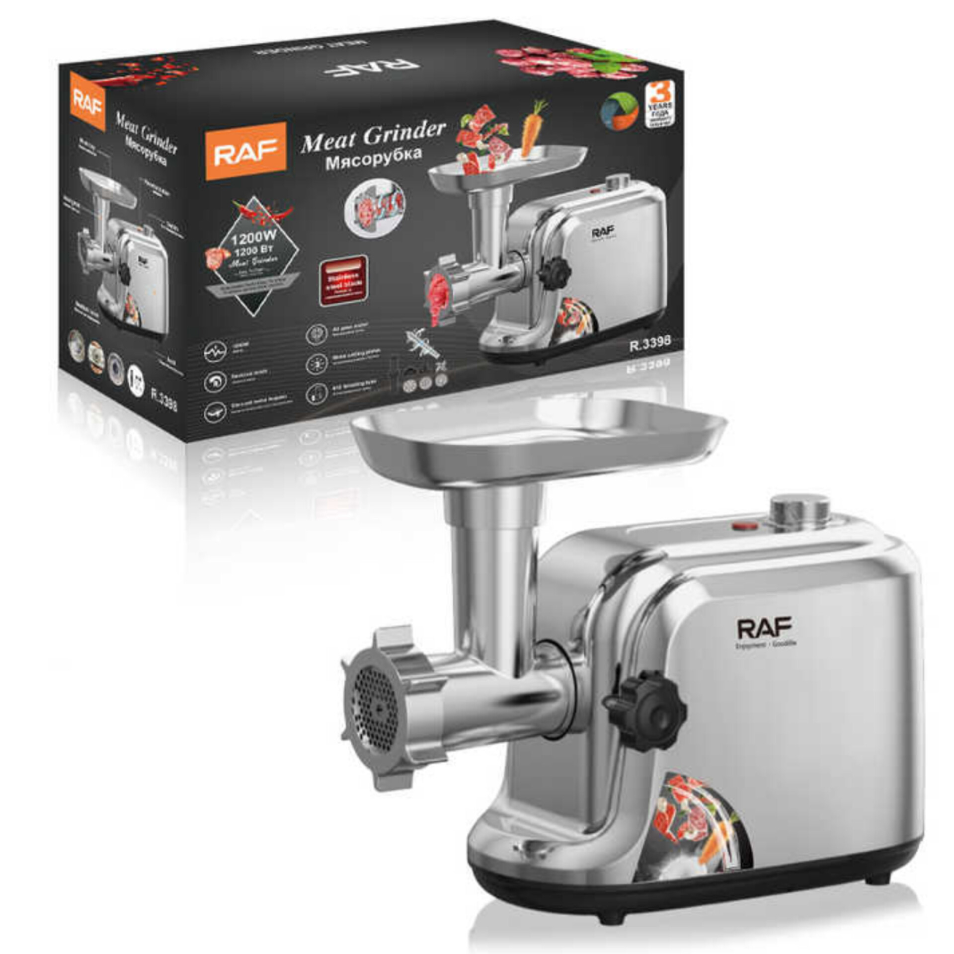 چرخگوشت R.3398، از جدیدترین و قدرتمندترین چرخ گوشت های این شرکت است که از طراحی بسیار زیبا و همچنین مدرنی ساخته شده است. این محصول قابلیت تنظیم سرعت در دو درجه متفاوت و همچنین عملکرد معکوس را دارد. توان موتور این دستگاه به واسطه تنظیمات سرعت آن 600 وات و 1200 وات می باشد. از دیگر ویژگی های این محصول میتوان به سینی آلومینیومی آن اشاره کرد که این ویژگی باعث طول عمر بیشتر سینی و زنگ نزدن آن در دراز مدت می شود. این دستگاه دارای 3 صفحه از جنس استیل ضد زنگ می باشد که این امکان را به ما می دهد که مواد غذایی را در سه سایز مختلف (ریز، متوسط و درشت) برش بزنیم. همچنین به همراه این محصول قطعات سوسیس ساز و کبه ساز و هم به کاربر ارائه میشود. در مجموع اگر به دنبال یک چرخ گوشت با کیفیت، خوش ساخت و زیبا می باشید که علاوه بر قدرتمند بودن، از طراحی ظاهری شیکی نیز برخوردار باشد، این چرخ گوشت میتواند یک گزینه ی عالی برای شما می باشد تا علاوه بر عمل بر کمک به شما در آشپزی، دکوراسیون شما را نیز تکمیل کند.
