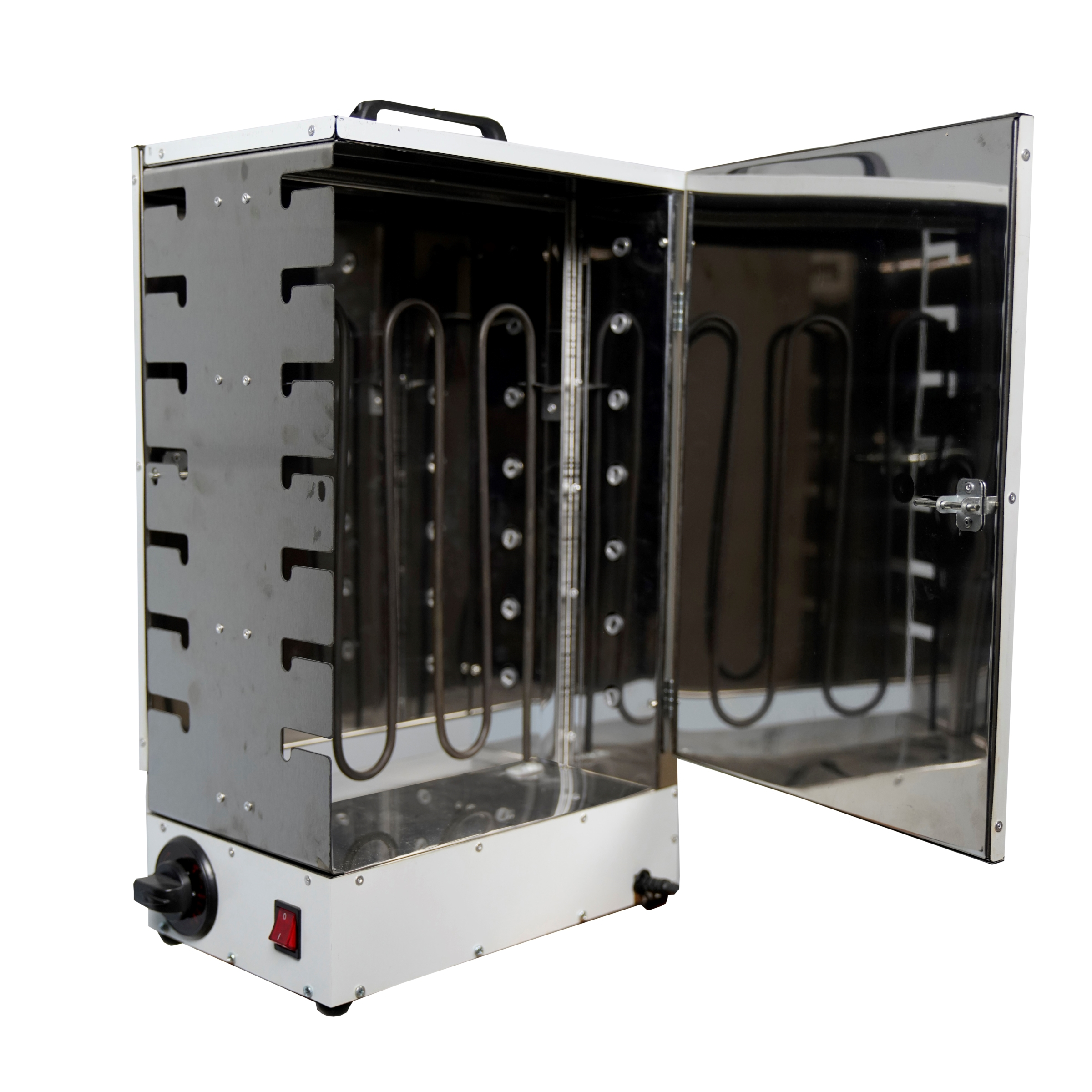 بدنهی دوجداره و منحصر به فرد این دستگاه باعث راندمان بالا و صرفهجویی در مصرف برق میشود. همچنین به دلیل قرارگیری المنت در کنار مواد غذایی و عدم برخورد مستقیم حرارت به آن پخت کباب کاملا بدون دود انجام میشود. در ضمن به دلیل قرارگیری سیخها به صورت افقی امکان ریزش مواد غذایی به هنگام پخت نیز وجود ندارد.