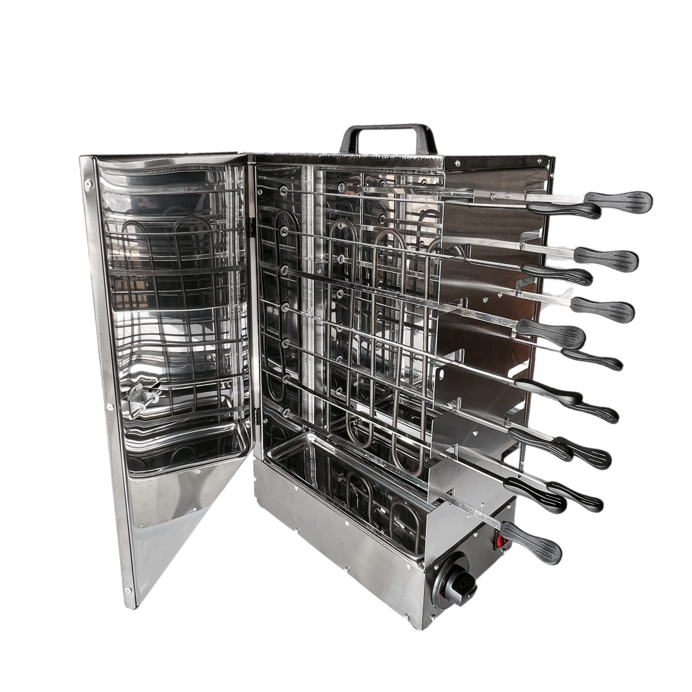 بدنهی دوجداره و منحصر به فرد این دستگاه باعث راندمان بالا و صرفهجویی در مصرف برق میشود. همچنین به دلیل قرارگیری المنت در کنار مواد غذایی و عدم برخورد مستقیم حرارت به آن پخت کباب کاملا بدون دود انجام میشود. در ضمن به دلیل قرارگیری سیخها به صورت افقی امکان ریزش مواد غذایی به هنگام پخت نیز وجود ندارد.
