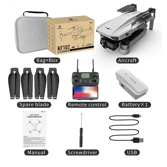 در جعبه کوادکوپتر حرفه ای KF102 6K لوازمی که در اختیار شما قرار می گیرد عبارتند از : کواد کوپتر، ریموت کنترل، یک عدد باتری، کابل شارژ، ۲ عدد ملخ یدکی، پیچ گوشتی، کیف حمل و دفترچه راهنما